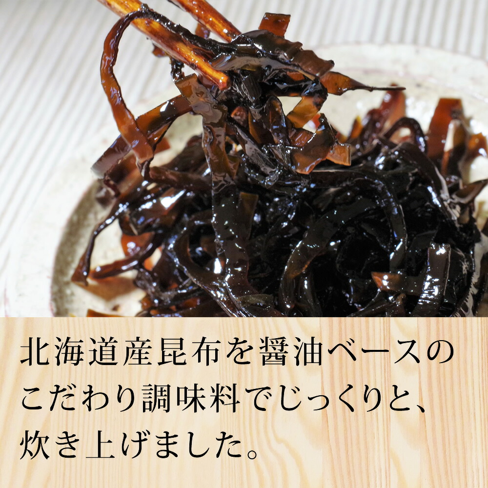 | 原材料名 | 昆布(北海道産)、醤油、砂糖、還元水飴、食塩、酵母エキス、米糀パウダー、(一部に大豆・小麦を含む) |