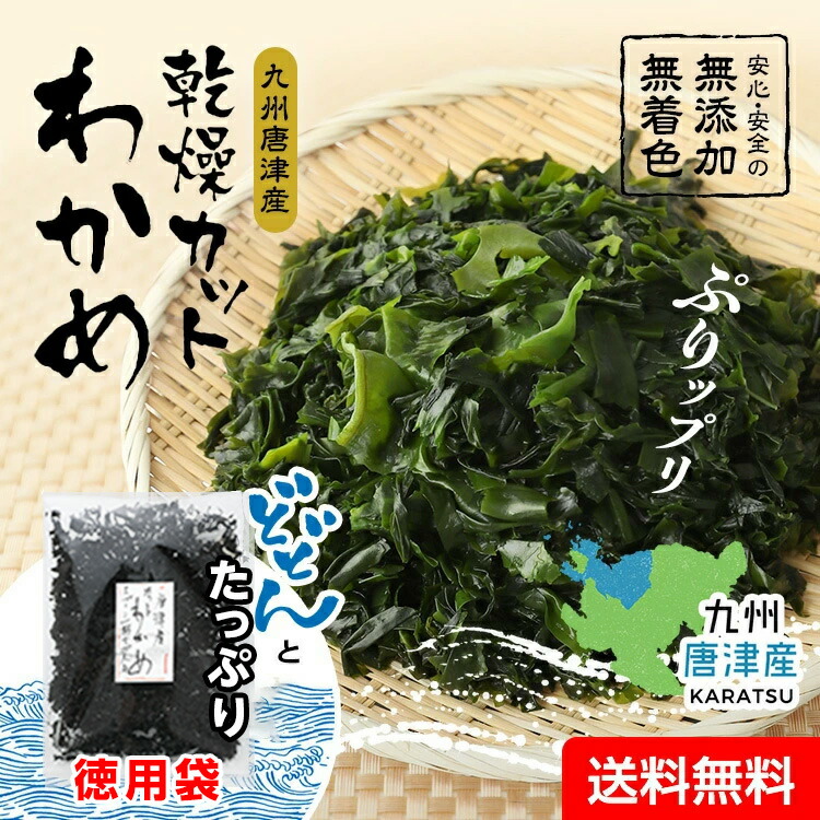 商品名/無添加・無着色 九州唐津産 乾燥カットわかめ 徳用袋、内容量/乾燥カットわかめ 60g入、賞味期限/直射日光・高温多湿を避けて、常温(10度~25度)にて保存にて180日、保存方法/直射日光・高温多湿を避けて、常温(10度~25度)にて保存、原材料/原産国/加工地/原材料原産地/佐賀県唐津市、加工地/熊本県、原材料/湯通し乾燥ワカメ ※ 無添加・無着色にて、酸化防止剤、保存料、着色料、等は一切使用しておりません。 ※ 送料無料の冷凍商品と同梱可能 ※メール便でのお届けとなりますので、代金引換でのお支払、配達日時のご指定はできません。九州の唐津で摂れた新鮮なわかめを使用しており、自然の磯の香りが味わえます。【smtb-ms】【楽ギフ_包装】【楽ギフ_のし】【楽ギフ_メッセ】販売者/佐賀県唐津市二タ子2丁目2-43、岩本商店 TEL:0955-72-4665